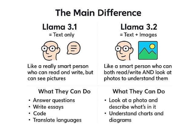 Compare Llama 3.1 vs 3.2 across multimodal capabilities, model sizes, and practical use cases to choose the right model.